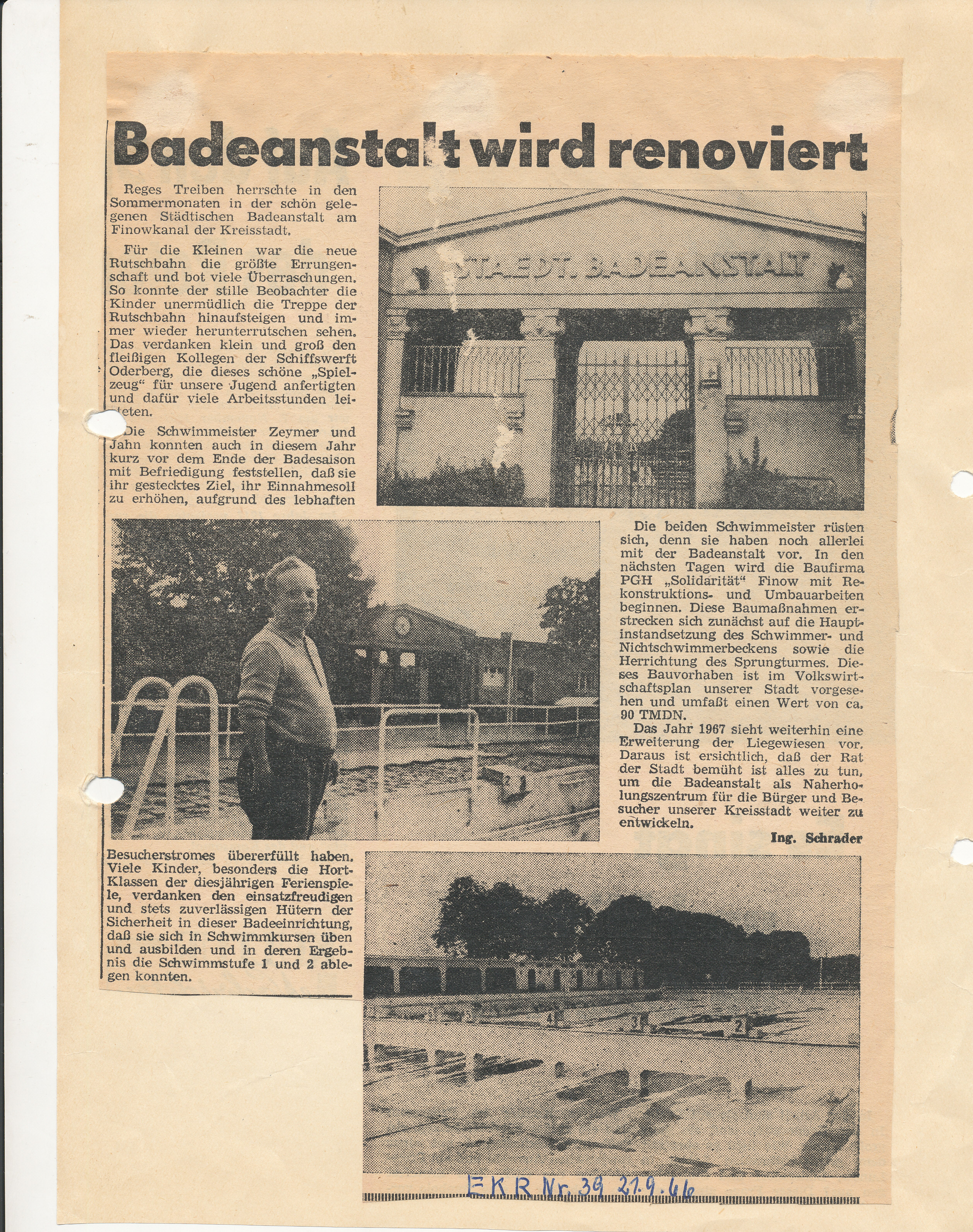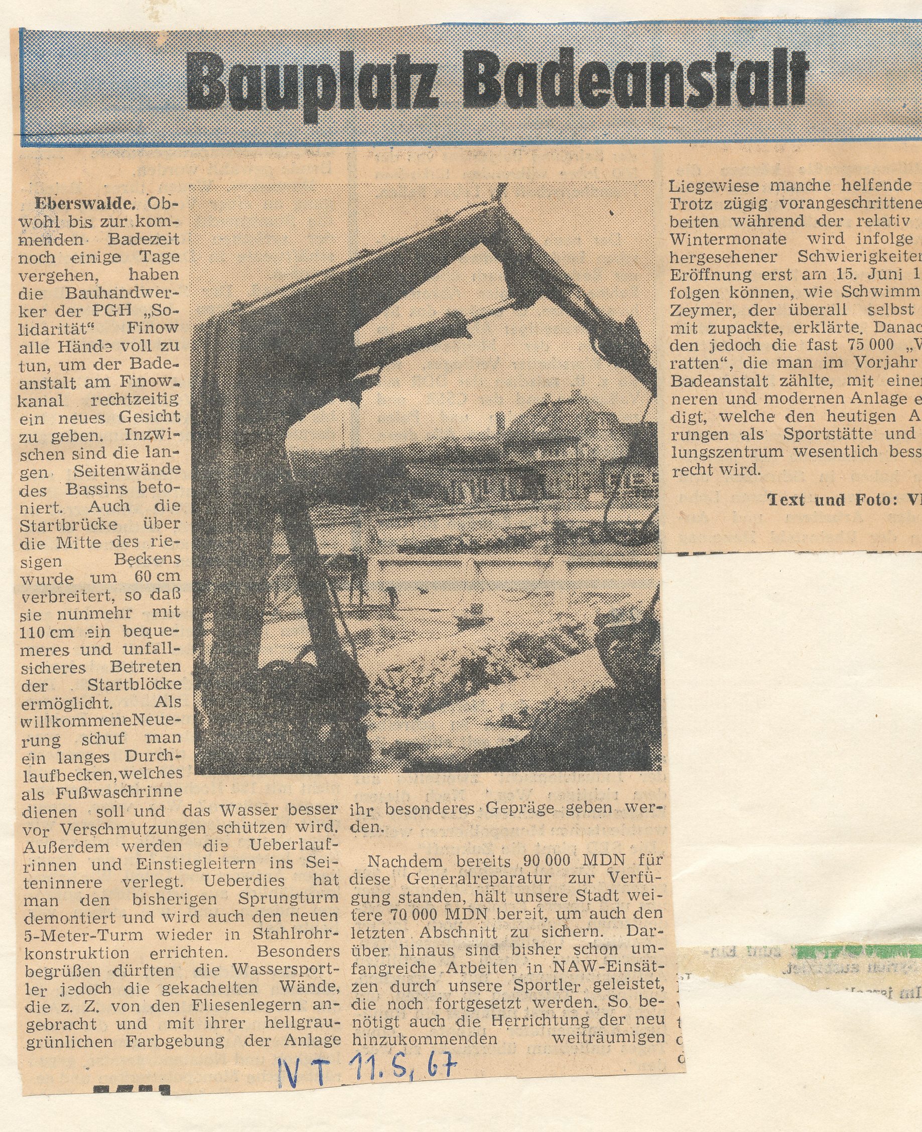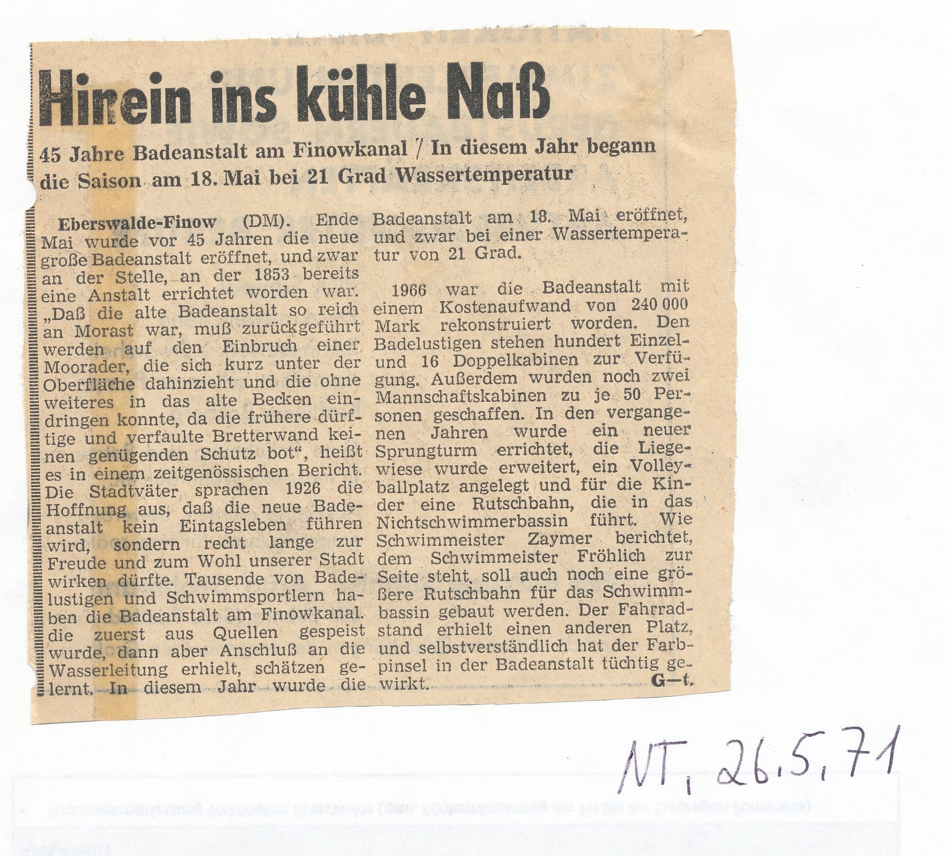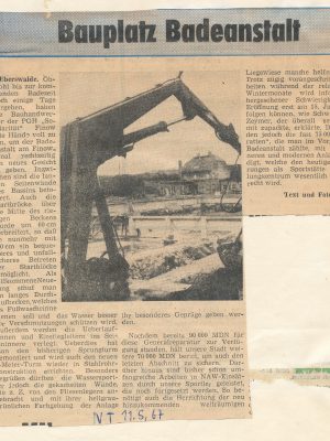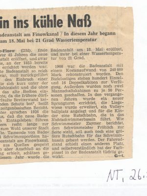 - o.A. (1971): Hinein ins Kühle Nass. 45 Jahre Badeanstalt am Finowkanal / In diesem Jahr begann die Sasion am 18. Mai bei 21 Grad Wassertemperatur. (26. Mai 1971). NT.