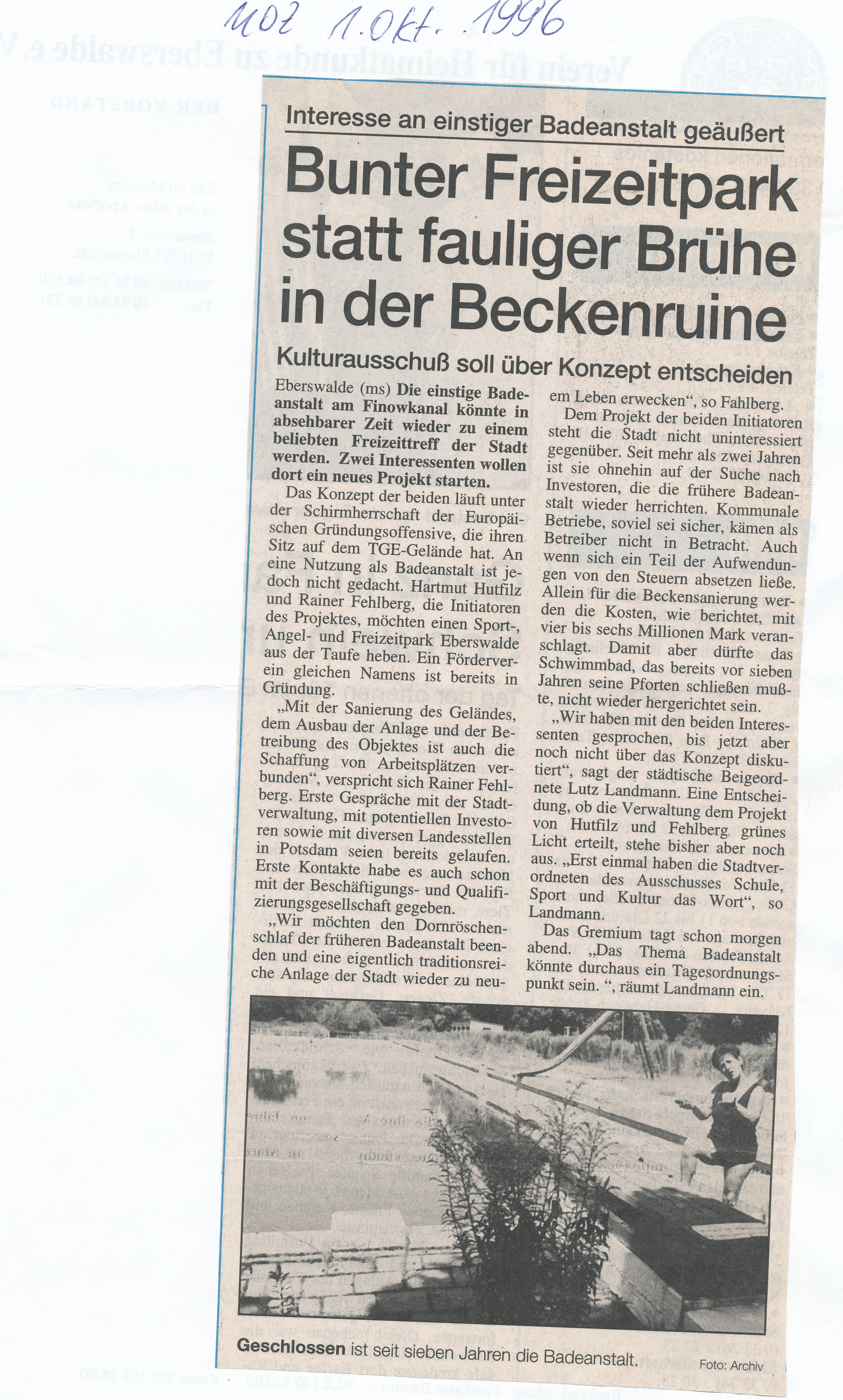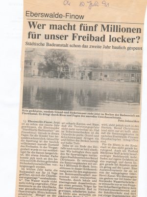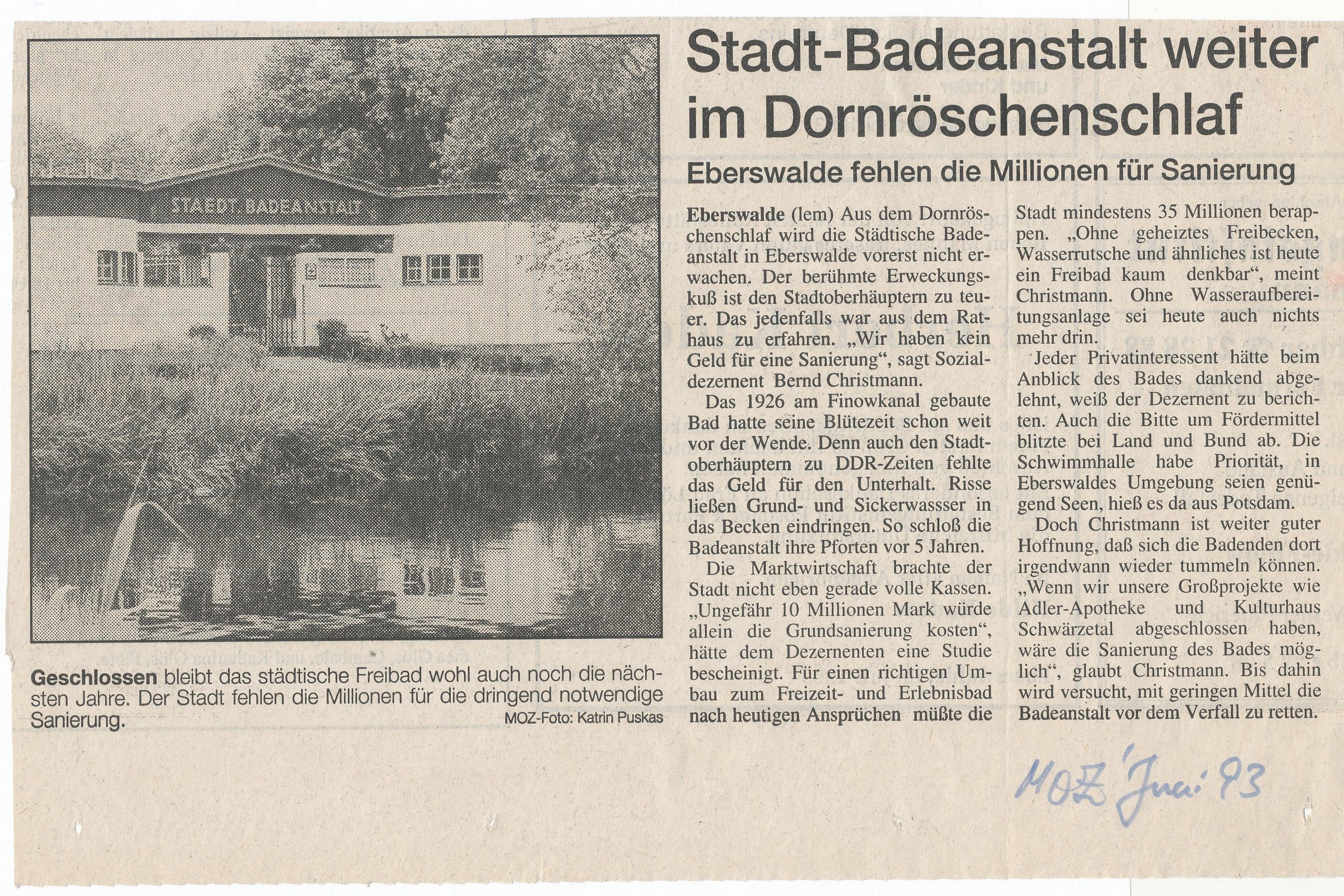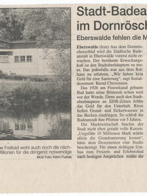 - o.A. (1993): Stadt-Badeanstalt weiter im Dornröschenschlaf. Eberswalde fehlen Millionen für die Sanierung . (Juni 1993). MOZ.