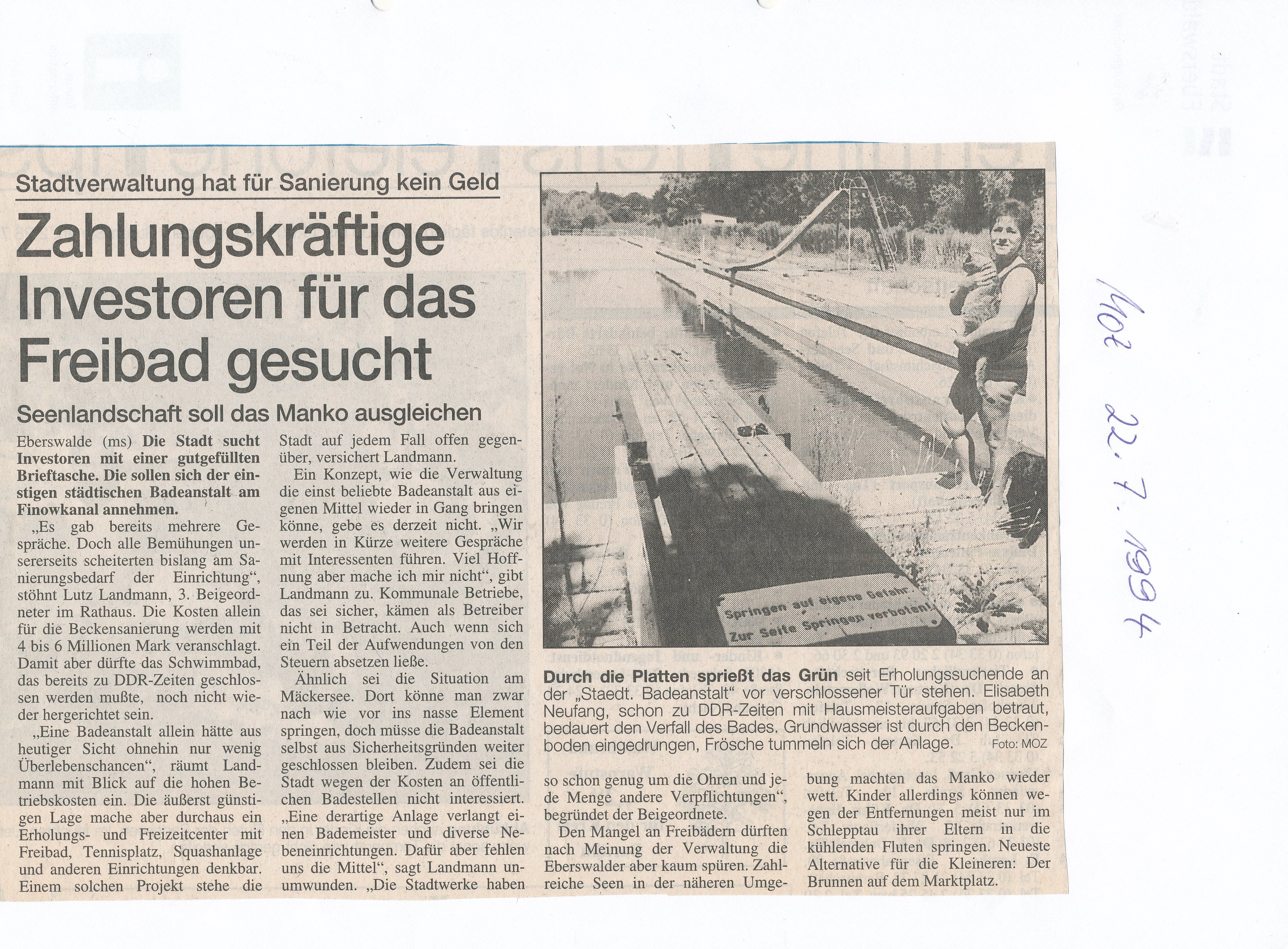 - o.A. (1994): Stadtverwaltung hat für Sanierung kein Geld. Zahlungskräftige Investoren für das Freibad gesucht. Seenlandschaft soll das Manko ausgleichen. (22. Juli 1994). MOZ.