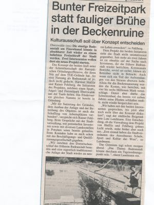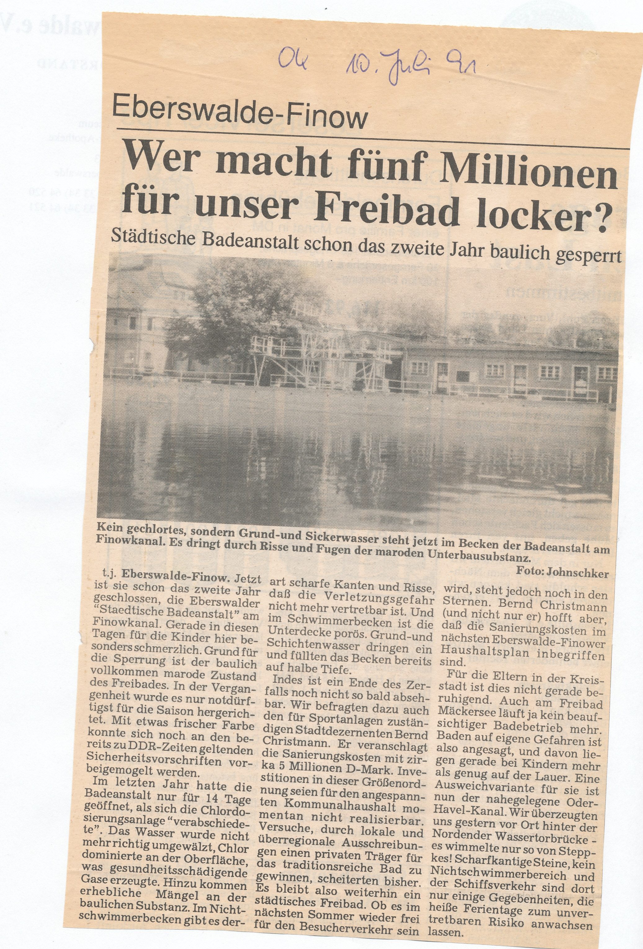 - o.A. (1991): Wer macht fünf Millionen für unser Freibad locker? Städtische Badeanstalt schon das zweite Jahr baulich gesperrt. (10. Juli 1991) OK.