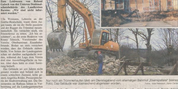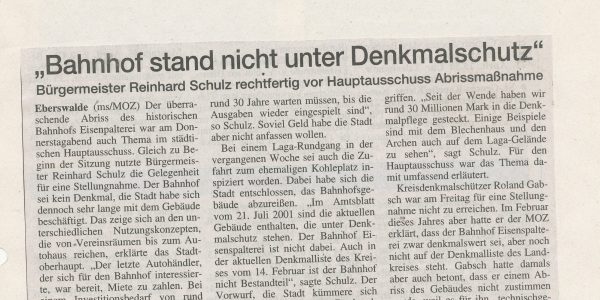 • o.A. (2002): Bahnhof stand nicht unter Denkmalschutz. Bürgermeister Reinhard Schulz rechtfertigt vor Hauptausschuss Abrissmaßnahme. MOZ, 14.02.2002.