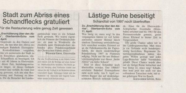 • Götze, A. (2002). Leserpost. Lästige Ruine beseitigt. Schandtat von 1997 noch übertroffen. MOZ, 14. April 2002.