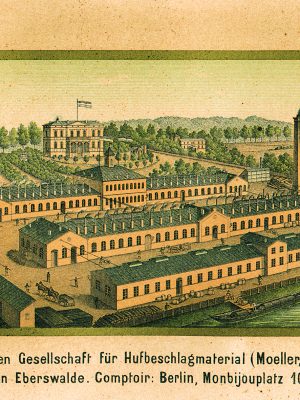Ab dem Jahre 1871 befand sich im Eberswalder Stadtteil Kupferhammer, am Kupferhammerweg 6/7 eine Hufnagelfabrik mit umfangreichen Fabrikgebäuden (Laska, o.J.). Den Standort in Eberswalde hatten die Betreiber Julius Moeller und Clemens auf Grund der guten Lage zwischen dem Finowkanal und dem Bahndamm für ihr junges aufstrebendes Unternehmen gewählt (ebd.). Hier wurden Hufnägel erstmals maschinell gefertigt und das Unternehmen wuchs schnell heran. Aufgegeben wurde es 1926 und ab 1946 bis in die 80er Jahre wurde das Werk auf Veranlassung der sowjetischen Administration wieder in Betrieb genommen (ebd.). Seit der Wende steht das Gelände leer und verfällt (ebd). Heute zeugen nur noch ein Schornstein und der rostende Waggonaufzug von der einst großen Fabrik (Laska, 2017).